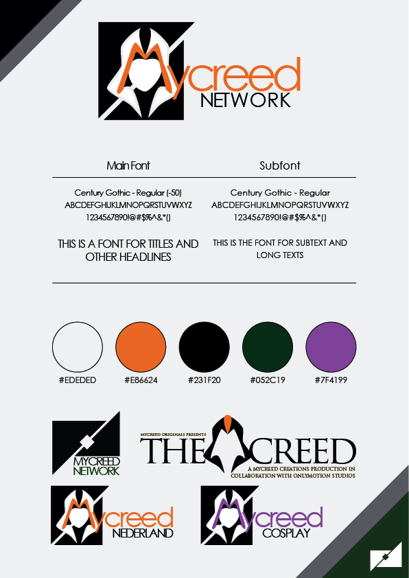 A sharp, contrast-driven identity for MyCreed Network, inspired by the visual language of Assassin’s Creed while keeping a clean, professional edge. The refined logo, paired with Century Gothic and a focused palette of orange, black, green, and purple, creates a system that feels bold yet controlled. Sub-brands slot in seamlessly, maintaining consistency while giving each branch its own presence; resulting in a streamlined, modernized take on the original concept. Original Logo’s and styling created by AivionStudios‘s Michael Braam.